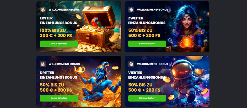 Dieses Paket ist in vier Einzahlungsboni unterteilt, die Du genießen kannst. Einige Boni sind mit Casino Bonus Codes versehen.